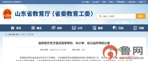 鲁网1月27日讯(记者 范金鑫)记者从山东省教育厅了解到,根据国务院和省委省政府有关文件精神,为加强新型冠状病毒感染的肺炎疫情防控工作,有效减少人员聚集,确保广大师生生命安全和身体健康,山东省教育厅新型冠状病毒感染的肺炎疫情防控工作领导小组研究决定,全省高等学校、中小学、幼儿园推迟2020年春季学期开学,具体开学时间另行通知。推迟开学期间,各市、县(市、区)教育行政部门和学校,要尽可能利用互联网和信息化教育资源为学生提供学习支持,指导学生安排好在家的学习和生活。