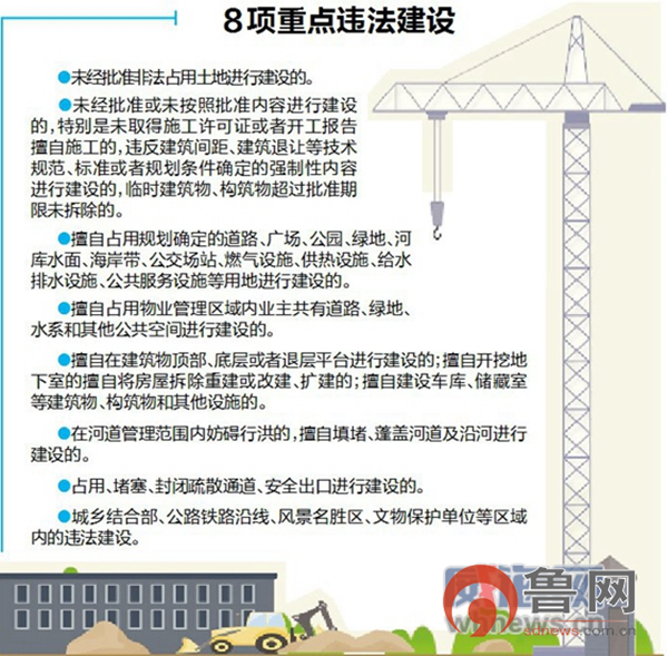 此次行动对治理重点做了明确规定,将未经批准非法占用土地进行建设、未经批准或未按照批准内容进行建设等8种违法建设列入治理重点,在全市范围内打响治理违法建设的“攻坚战”。
