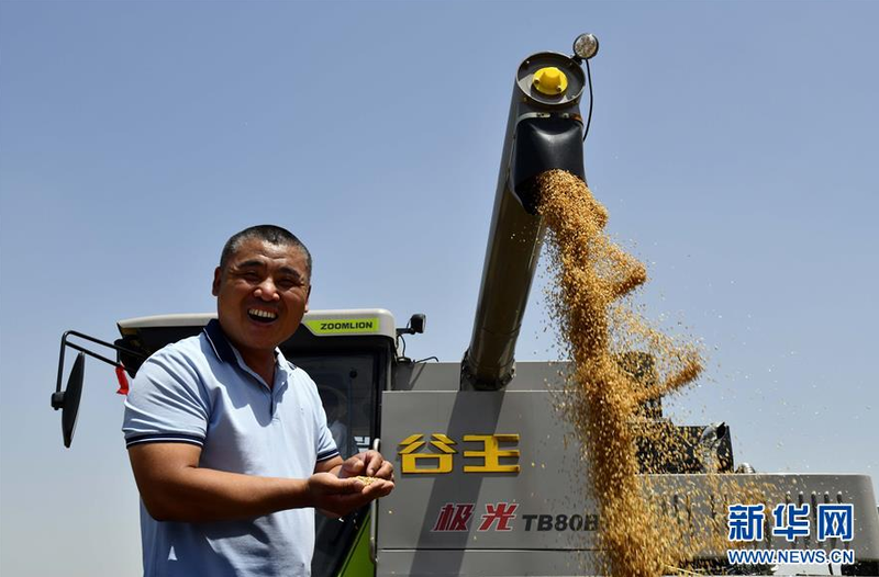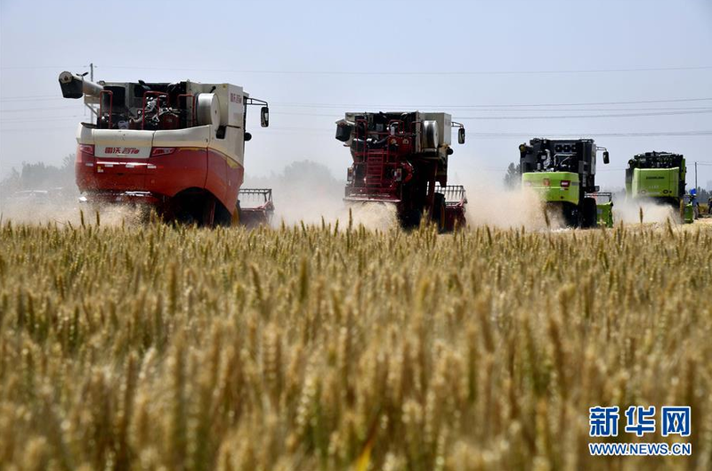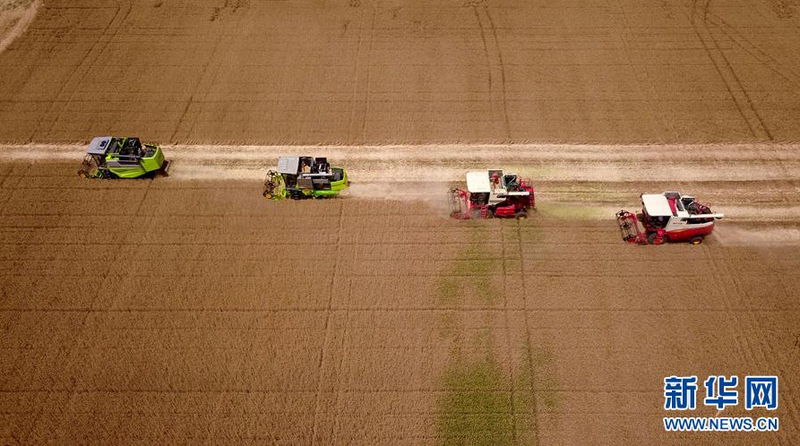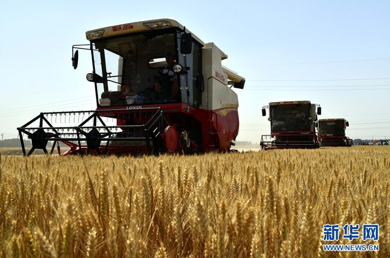 6月3日,在汶上县郭仓镇,种粮大户郭波波在收获小麦。目前,我国第二大小麦生产区山东6000多万亩小麦进入收获阶段。农民们抢抓有利天气,自南向北陆续开镰。新华社记者 郭绪雷 摄