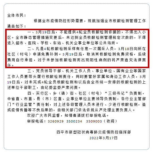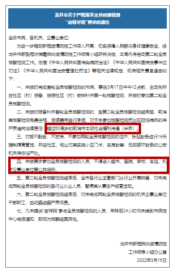青岛网上辟谣平台(piyao.qdxin.cn)搜证发现,在吉林省龙井市和四平市发布的加强全员核酸检测管理工作的通告中,提到了上述相关内容。此外,3月17日深圳市福田区福田街道新型冠状病毒肺炎疫情防控指挥部发出通知称,不配合核酸检测和网格登记的,均在网格采集系统注销信息,由此可能影响社保购买、就学就业等。