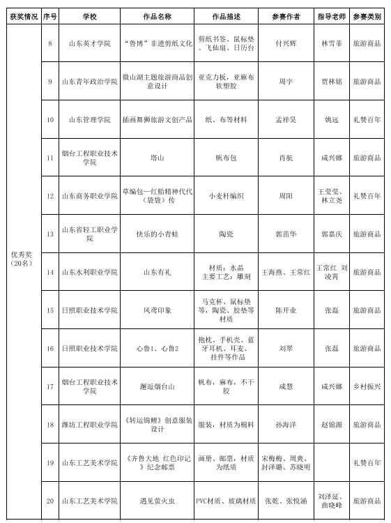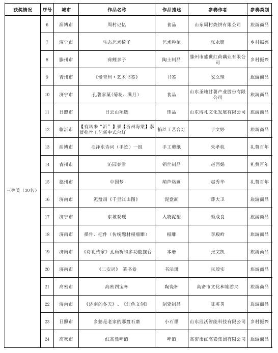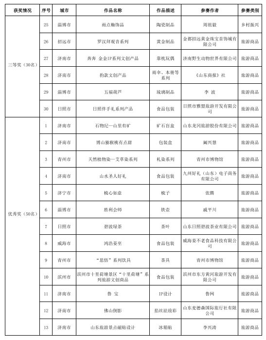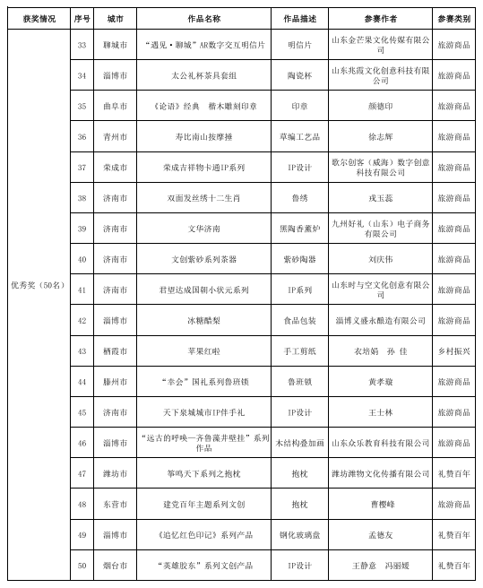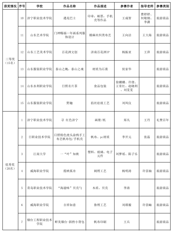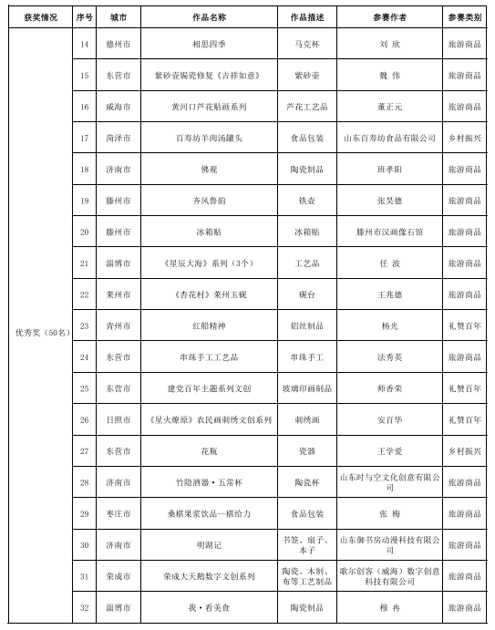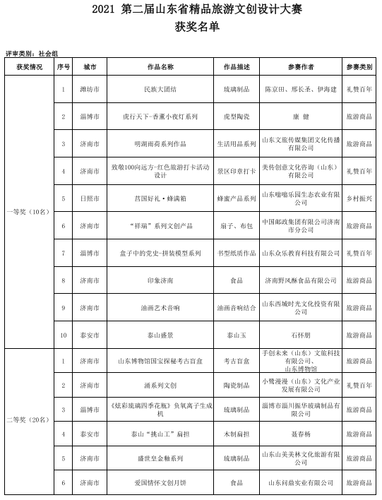 鲁网10月29日讯 2021年6—10月,由省总工会、省新旧动能转换综合试验区建设办公室、省人力资源和社会保障厅、省文化和旅游厅、省精品旅游促进会共同主办,省教育厅支持的“2021第二届山东省精品旅游文创设计大赛”,严格按照统一报名参赛、网络投票、专家评审、组委会审核等程序进行,评审工作圆满完成,现将大赛获奖名单予以公布。