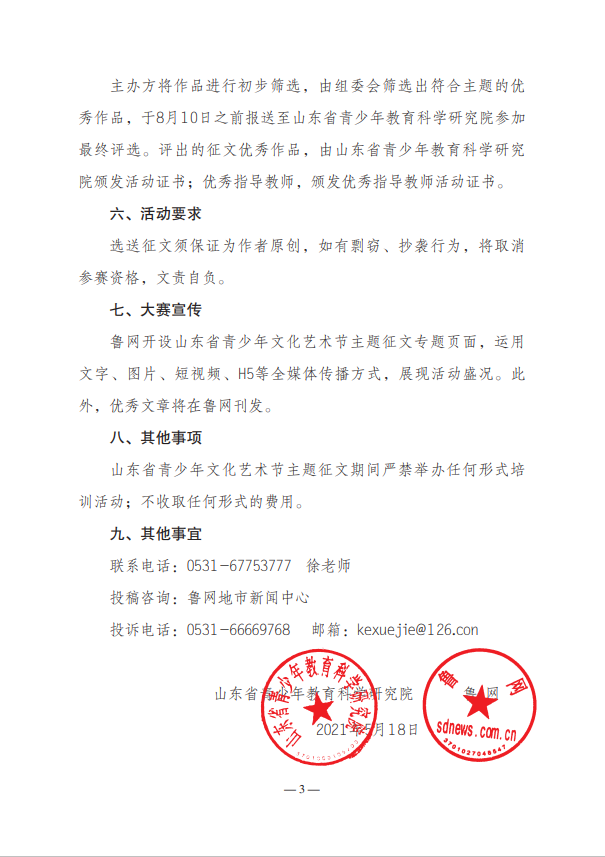 山东省青少年文化艺术节主题征文期间严禁举办任何形式培训活动;不收取任何形式的费用。