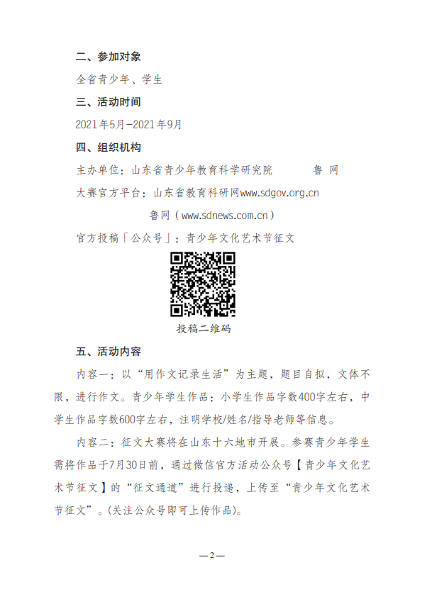 内容二:征文大赛将在山东十六地市开展。参赛青少年学生需将作品于7月30日前,通过微信官方活动公众号【青少年文化艺术节征文】的“征文通道”进行投递,上传至“青少年文化艺术节征文”。(关注公众号即可上传作品)。