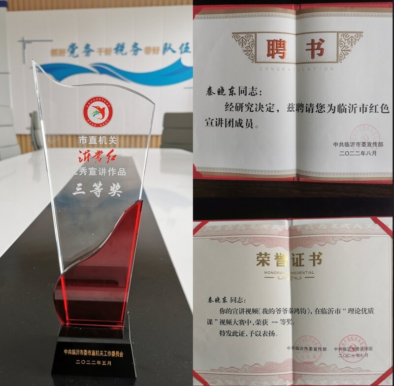2021 年至 2022 年期间,秦晓东积极参与各类宣讲活动,获得了多个奖项和荣誉称号。他主讲的《我的爷爷秦鸿钧》微视频党课更是斩获多项大奖。2023 年,他参与拍摄录制的《永不消逝的红色电波》和《永不消逝的电波》微电影也分别在全省党员教育电视片(党课)评选和亚洲微电影艺术节等赛事中获奖。
