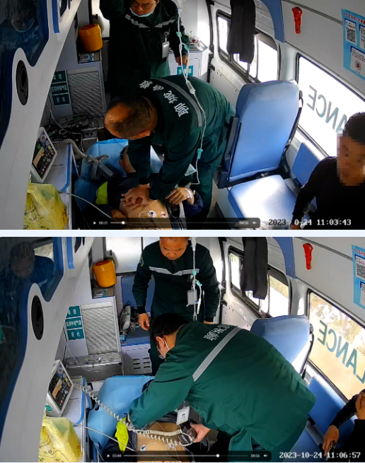 转运途中,患者又发生室颤,意识丧失,经过徐庆祥和急诊科医护人员反复除颤4次后恢复窦性心律,意识恢复正常。途中经过远程会诊,院内急救与心内科协同救治,为患者下一步的救治争取了宝贵的时间。到达医院抢救室,当时刘洪光主任已在急诊科做好了救治病人的准备。