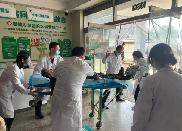 24日上午10时左右,正在医联体单位聊城侯营镇卫生院坐诊的苑晓春医生看到有两位工人急匆匆地搀扶一位急症患者进入诊室,病人中年男性,大约五十多岁,大汗淋漓,表情痛苦,苑晓春立即询问患者情况,他说:“心里难受,出大汗。”根据临床经验,苑晓春医生判断患者为急性心肌缺血,急性心肌梗死可能性大,立即安排患者平躺在诊室检查床上做心电图,显示“急性广泛前壁心肌梗死”,立即给予“硝酸异山梨酯片10mg 舌下含化”“速效救心丸10丸 舌下含化”“拜阿司匹林300mg 嚼服”,并输注盐水维持冠脉灌注,开通静脉通路,用药后患者心前区症状稍微缓解。同时安排联系“120”前来转运患者。