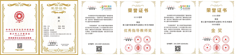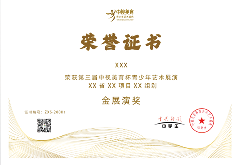 参加央视现场展演的节目,由中央新影中学生频道(原CCTV中学生频道)向参赛个人颁发全国荣誉证书+全国社会实践成果证书+荣誉奖杯。