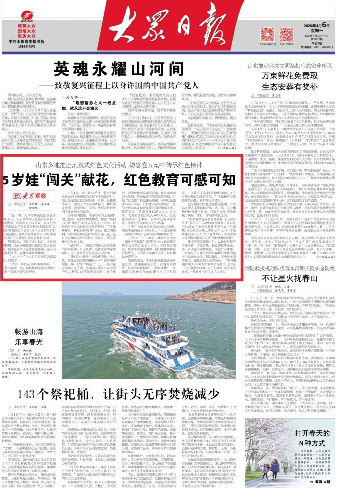 《大众日报》头版刊发 | 《山东多地推出沉浸式红色文化活动,游客在互动中传承红色精神——5岁娃“闯关”献花,红色教育可感可知》。