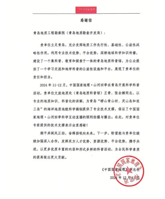 近日,山东省地矿局青岛地质院收到《中国国家地理》杂志社发来的感谢信,对青岛地质院为中国国家地理·山河四季在青岛开展的海洋地质地貌科学科普活动提供的专业技术支撑表示诚挚的感谢。
