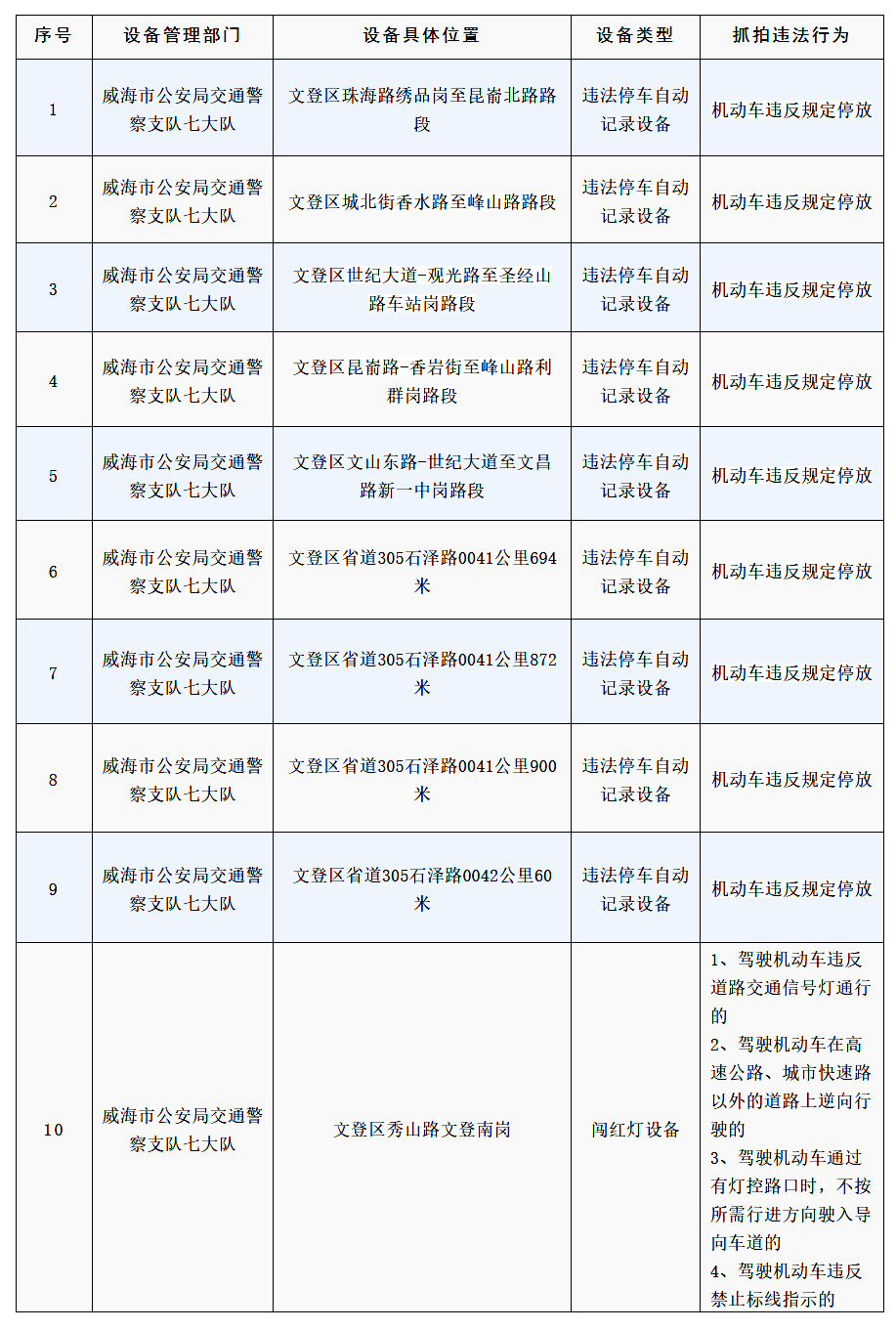 文登区新增10处共10个交通技术监控设备予以公示,自12月15日起,将对有关交通违法行为进行依法管理