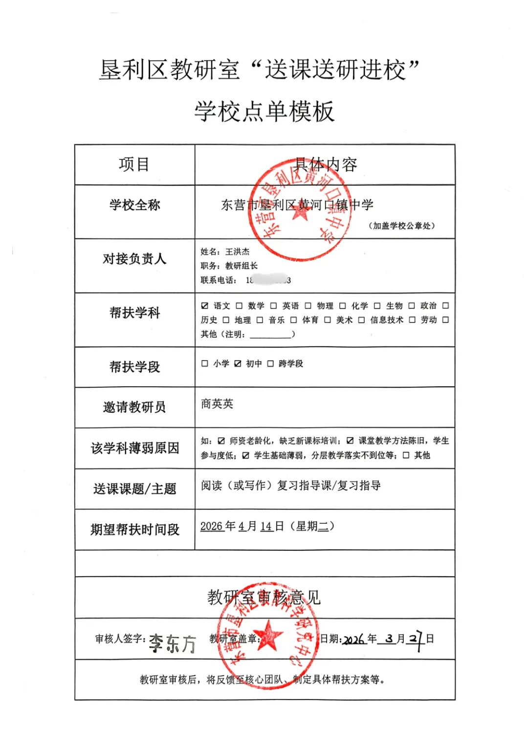 鲁网3月31日讯 为切实破解教学实践中的难点问题,精准对接一线教学需求,持续推动区域义教段教学质量提质增效,东营市垦利区教育科学研究中心在2024年组织教研员、市级教学能手开展第一轮巡课送课、2025年组织市级青年培养对象开展第二轮巡课助研的基础上,于2026年3月组织全区学科教学成果显著的优秀教师,开展第三轮“送课到校”活动,以优质教研资源下沉为抓手,为学校教学发展精准赋能。
