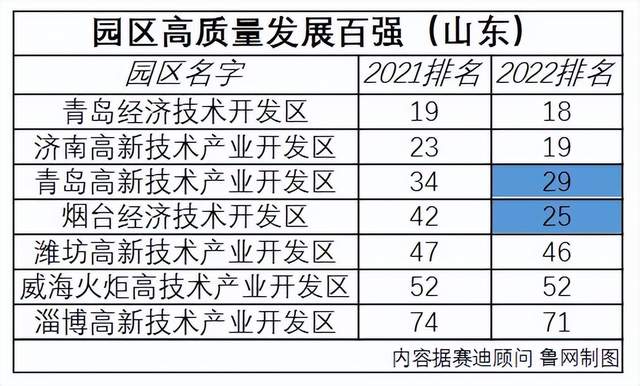 此次山东上榜的7大园区分别是:青岛经济技术开发区,位列第18位;济南高新技术产业开发区,位列第19位;烟台经济技术开发区,位列第25位;青岛高新技术产业开发区,位列第29位;潍坊高新技术产业开发区,位列第46位;威海火炬高技术产业开发区,位列第52位;淄博高新技术产业开发区,位列第71位。