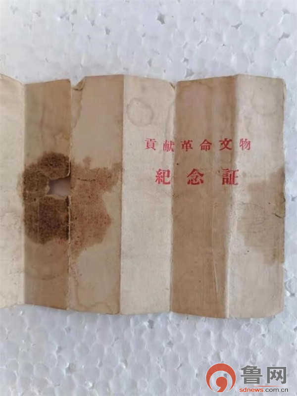 图7:莱芜县在1960年发给毕奉先之子毕济东的《贡献革命文物纪念证》