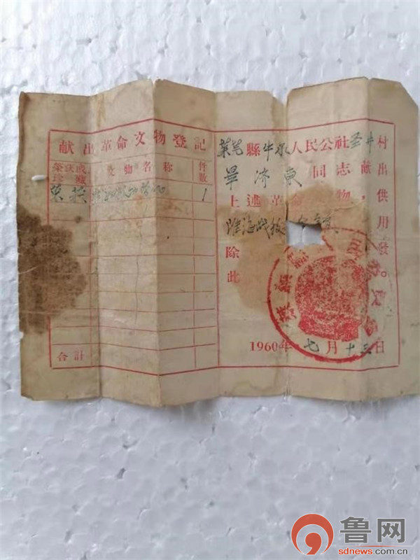 在李圣才给毕于华留下电话号码几天后,他打电话说找到了一份文物捐献证并发来了照片。原来这是一份《贡献革命文物纪念证》,由莱芜县委在1960年颁发给毕济东的,是毕济东获得的淮海战役功劳证捐给淮海战役纪念馆后,莱芜县委制发的证书。经历60多年的时光,证书原件已经非常破旧,但是字迹和印章依然能辨析清楚。证书不仅是珍贵的文物,也是证明毕氏家族所做革命工作和革命贡献的重要证物。
