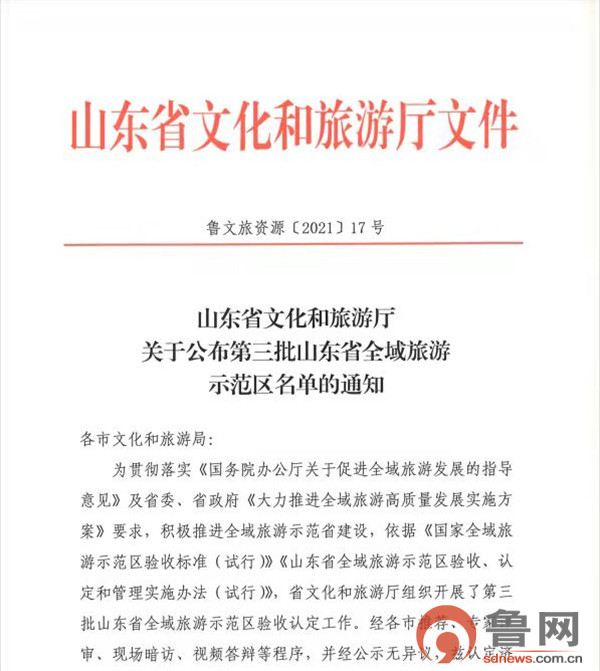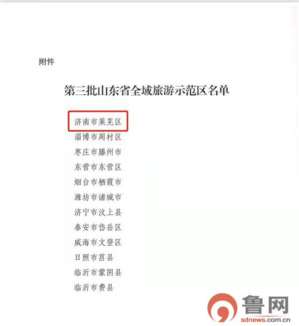 鲁网12月17日讯(记者 吕胜男)12月17日,山东省文化和旅游厅印发《关于公布第三批山东省全域旅游示范区名单的通知》,济南市莱芜区成功创建为山东省全域旅游示范区。