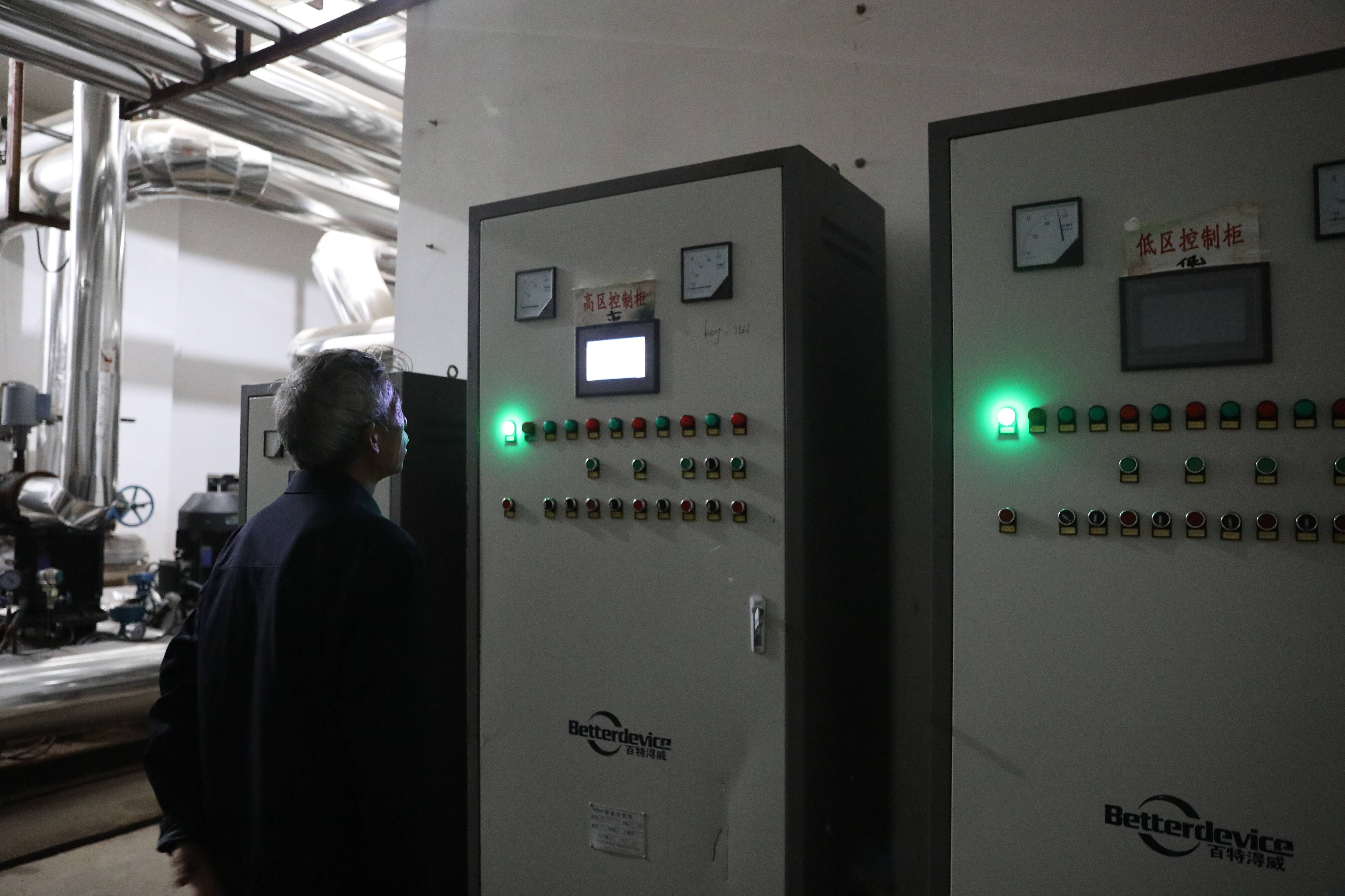 在盛世豪庭小区地下二层的换热站,不大的室内“五脏俱全”,供暖管家正在对站内设备进行例行巡检。