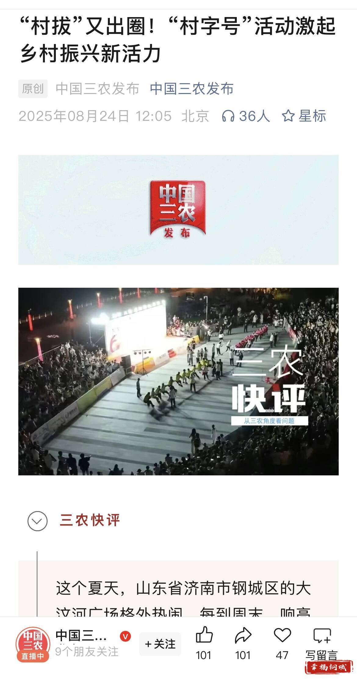 为推动特色赛事“出圈”,整合“主流媒体+新媒体”资源进行立体传播,大众日报、天下泉城等省市级媒体开展多元化宣传,并先后获得中央电视台(涵盖CCTV-2、CCTV-5、CCTV-17频道)的多栏目报道,更吸引了央视新闻记者亲临现场进行采访与直播。系统设计赛事LOGO、吉祥物、微信表情包等,推动钢城“村拔”品牌IP化。开展市场化招商,分层开发冠名权和赞助体系,为赛事可持续运营奠定基础。