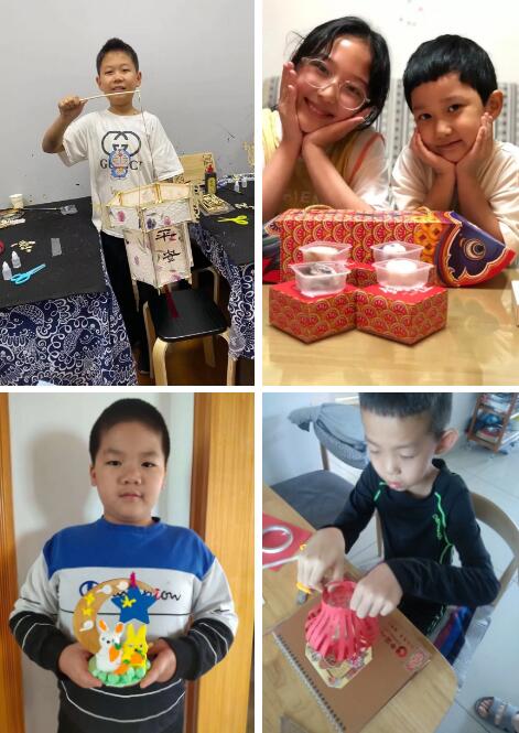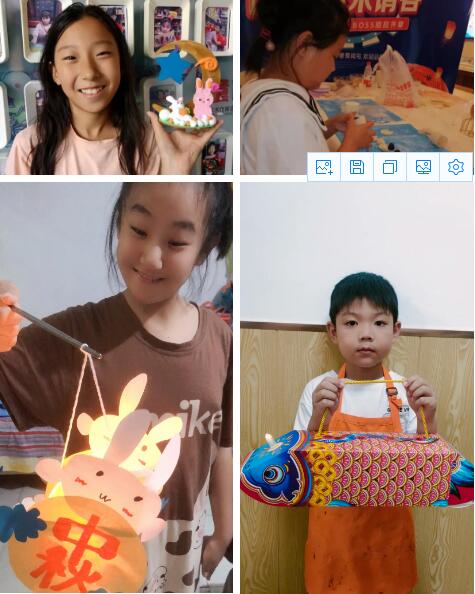 中秋节是中国传统节日,队员们利用假期了解中秋传统习俗,寻找代表性元素,制作中秋节主题手工,运用他们喜爱的超轻黏土来制作,灵巧的双手中变出了各种与中秋相关的造型,形式多种多样,平面的、立体的,造型生动、充满无限的创意,队员们还利用矿泉水瓶,纸盘等废旧材料,制作了可爱的兔子灯,一盏盏亮闪闪的小灯笼,像照亮夜空中最亮的星,盛满了对中秋的最美好向往。