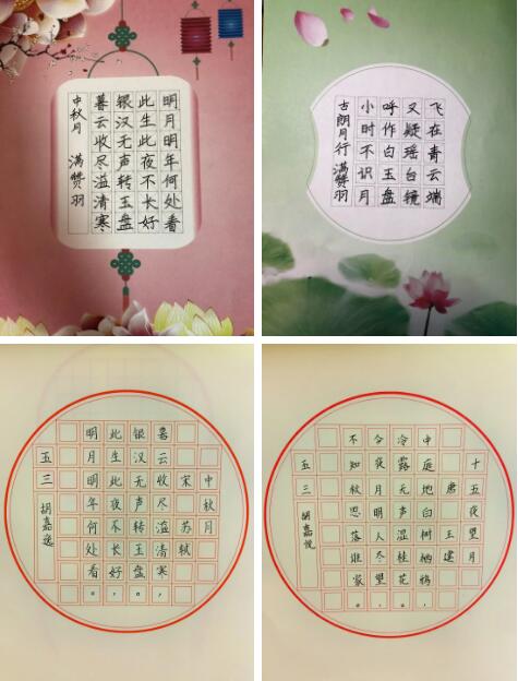 队员们欢度中秋之际写出一篇篇中秋佳节的感想,中秋故事、今昔往昔中秋节,一篇篇文章写出了队员们对新中国日新月异的变化的真实感受和最祖国的热爱与赞颂之情。会书法的队员还写出一副副与中秋相关的诗词,“千古名句传情意”。从古至今,多少文人墨客对着中秋皎洁的圆月,写下了动人的诗句名篇。队员们认真书写有关中秋的古诗词,或挥毫泼墨,笔走龙蛇;或铁划银钩,苍劲有力;或字若花瓣,清芬怡人。在这样的传承中,感受中华民族博大精深的传统文化魅力。