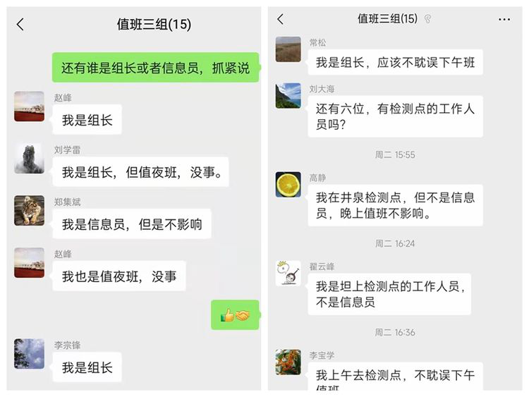 4月13日的值班,尤为不寻常。就在这天上午,普集街道刚开展了常态化不定期核酸检测。刘学雷、赵峰、高静、李莉芳、常松、李宝学等许多值班的同志都担任着核酸检测点的组长、信息员或现场工作人员,忙碌了一上午后又迅速投入到下午和晚上的值班工作中。在值班组长询问组员是否需要调整值班时间便于安排休息时,所有人都一致表示,上午的繁忙工作不会影响到下午和晚上的值班。