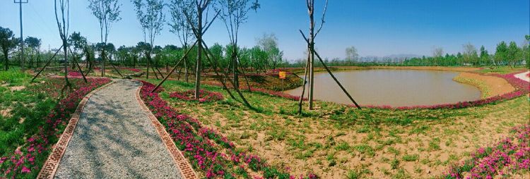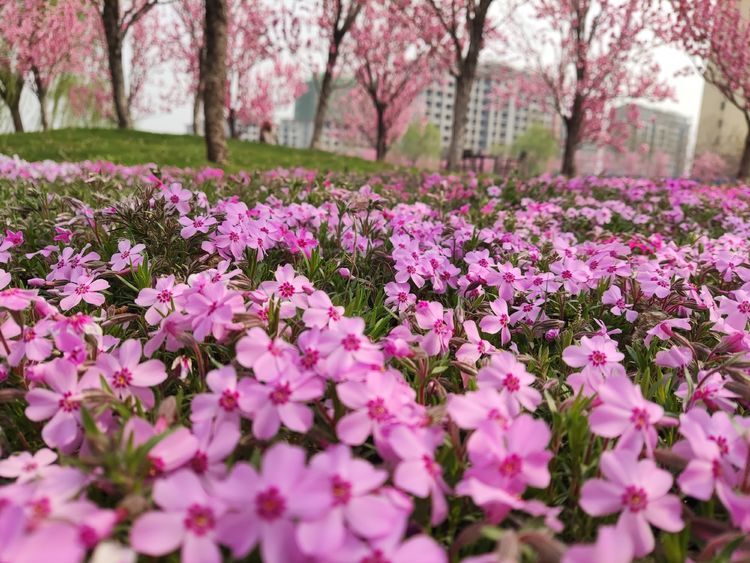 芝樱花海。芝樱是此时泉城百花园田园综合体中最显眼的花种之一,大片大片的粉紫色一股脑的涌进视野,渲染成这里春天最细腻的底色。在这里的春是粉色的,柔和而温热。芝樱花又名丛生福禄考,为常绿多年生植物,株限高10~15cm,节间的分生组织细胞活跃,匍匐生长。每年4月份次第开放,盛期如一片粉红色的地毯,并能散发出清香的味道,十分绚丽壮观。芝樱花花期可持续1.5~2个月,在半阴处也能正常的生长与开花,花色十分繁多,有大红色、粉红色、白色和紫色。