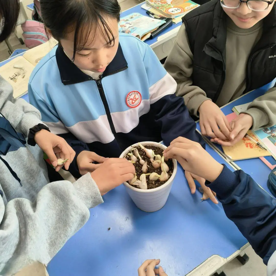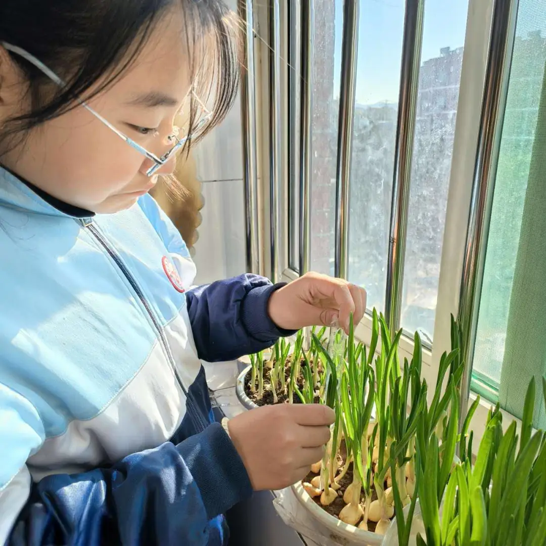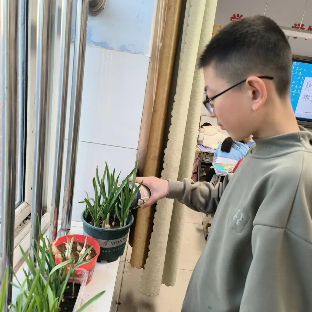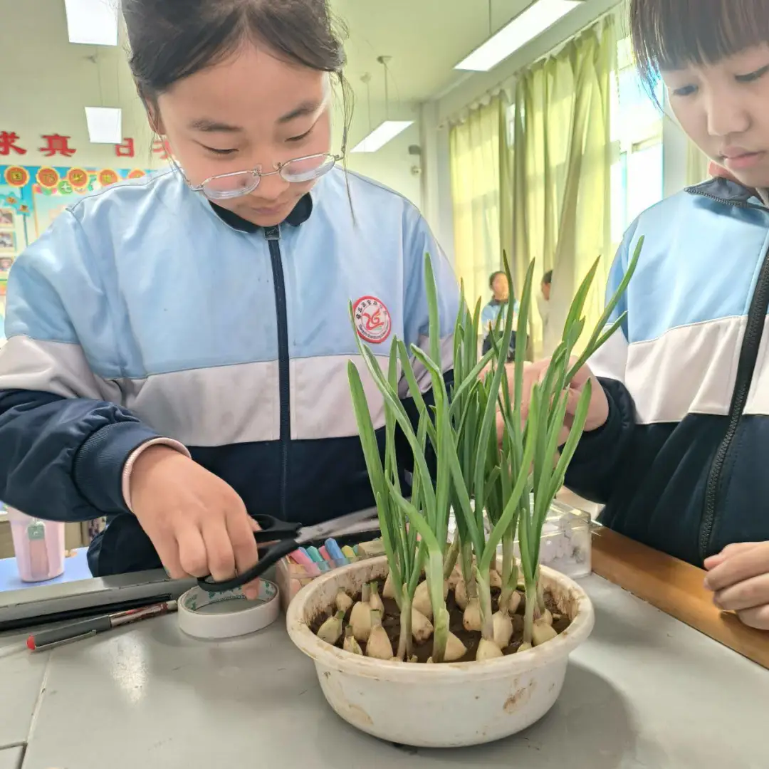 种好蒜种后,同学们便多了一份甜蜜的牵挂。每天清晨到校或课间时分,他们总迫不及待地跑到窗台前,给蒜苗浇水,仔细观察自己那片“小田园”。他们用直尺为蒜苗测量“身高”,用画笔在本子上认真描绘出新叶的每一丝变化。他们在日复一日的呵护中,不仅见证了生命的坚韧与奇迹,更体验了一次与自然生命的深入交流和情感联结。