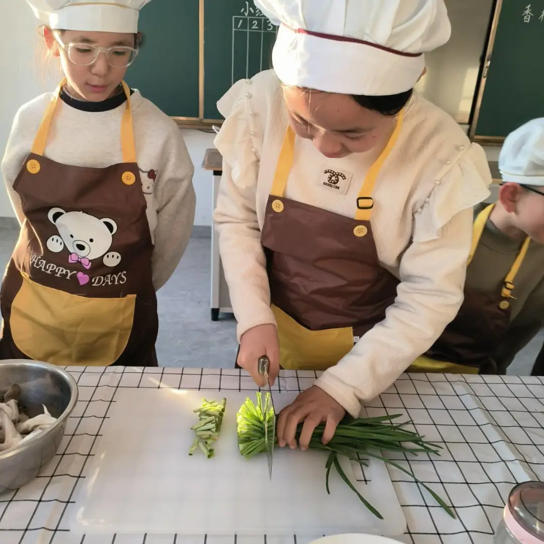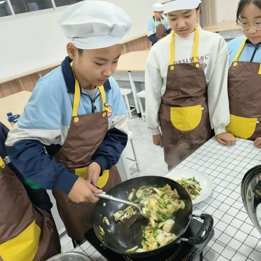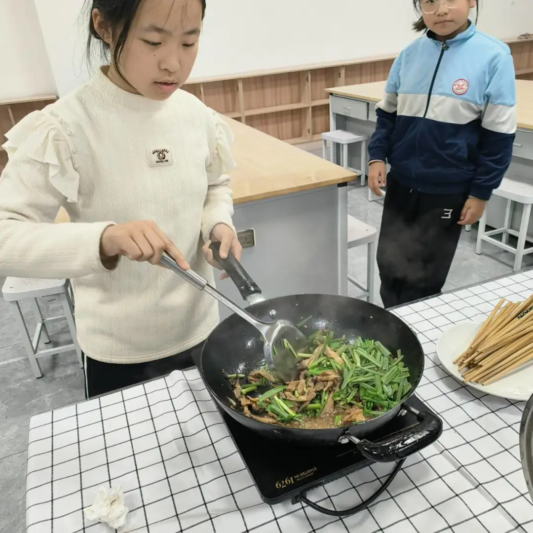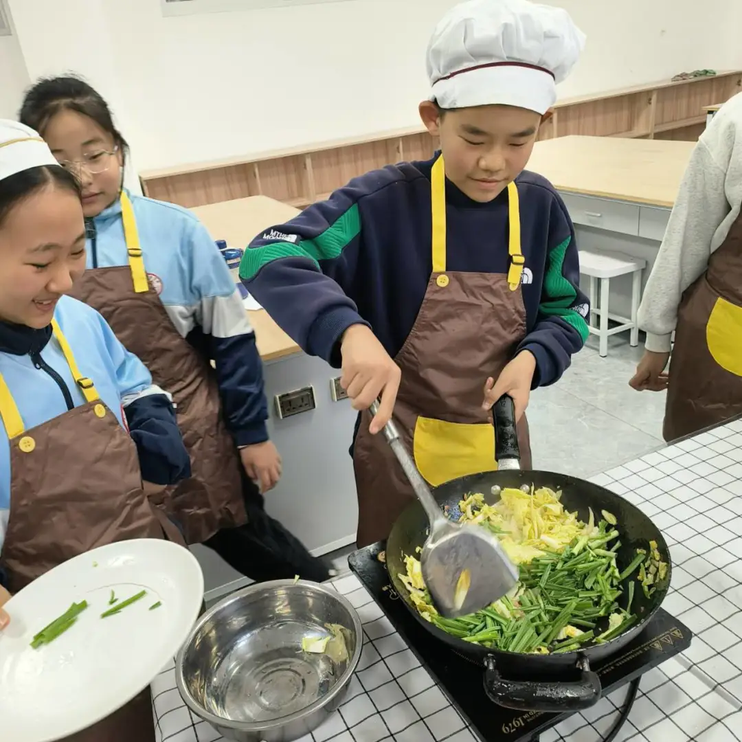 收获的蒜苗被带进劳动实践室,一场“舌尖上的盛宴”随即开启。同学们系上围裙,戴上厨师帽,瞬间化身“小厨神”。水龙头下,蒜苗被冲洗得碧绿发亮;案板上,手起刀落,清脆有声。热油在锅中滋滋作响,蒜苗与配菜相遇的刹那,香气轰然炸开,弥漫整个房间。当一盘盘金黄翠绿、热气腾腾的佳肴被郑重端出,他们脸上洋溢着劳动者独有的骄傲与幸福。