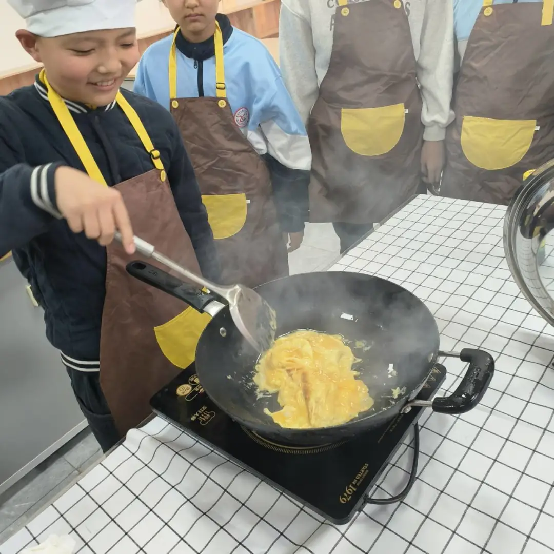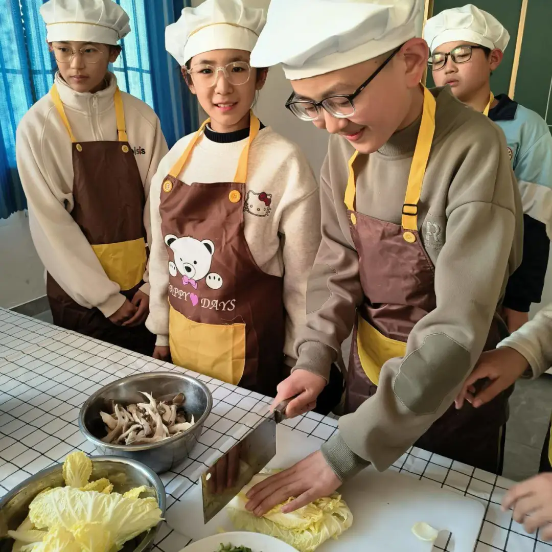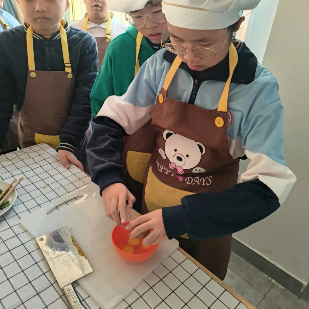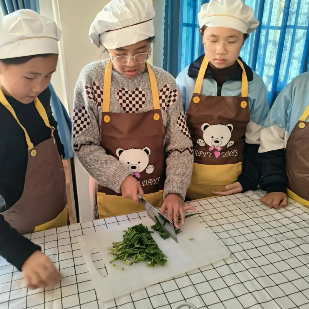 收获的蒜苗被带进劳动实践室,一场“舌尖上的盛宴”随即开启。同学们系上围裙,戴上厨师帽,瞬间化身“小厨神”。水龙头下,蒜苗被冲洗得碧绿发亮;案板上,手起刀落,清脆有声。热油在锅中滋滋作响,蒜苗与配菜相遇的刹那,香气轰然炸开,弥漫整个房间。当一盘盘金黄翠绿、热气腾腾的佳肴被郑重端出,他们脸上洋溢着劳动者独有的骄傲与幸福。