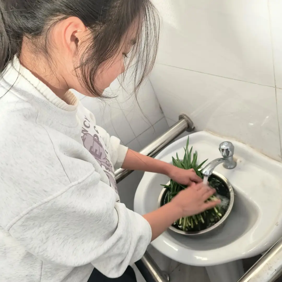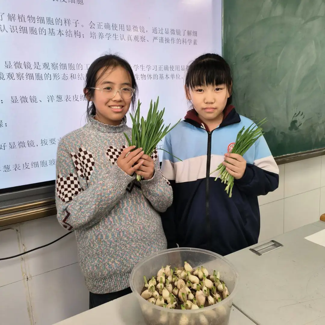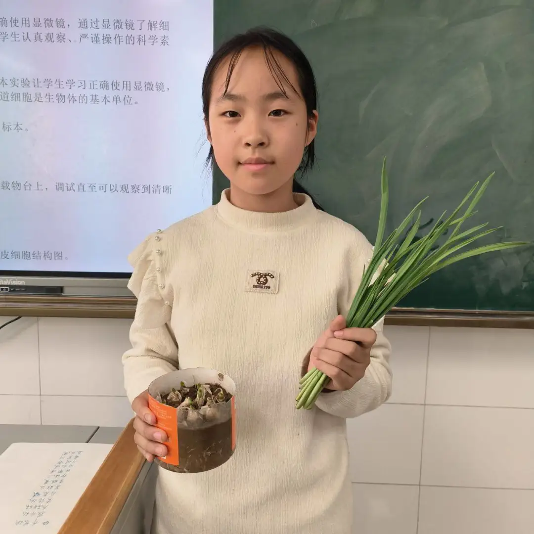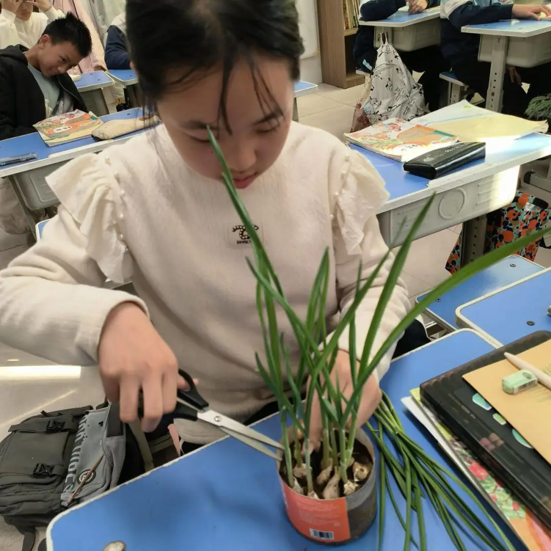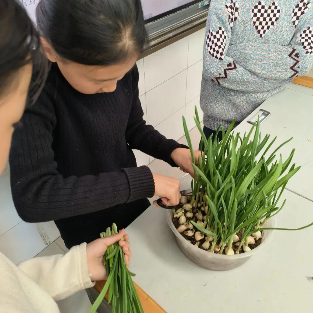 当碧绿的蒜苗亭亭玉立,同学们迎来了最激动人心的篇章——收获。他们小心翼翼地剪下自己精心培育的蒜苗,亲身体验收获的喜悦。这一刻,抽象的“一分耕耘,一分收获”化为了指尖可触的真实,同学们对“珍惜劳动成果”有了更深刻的理解。