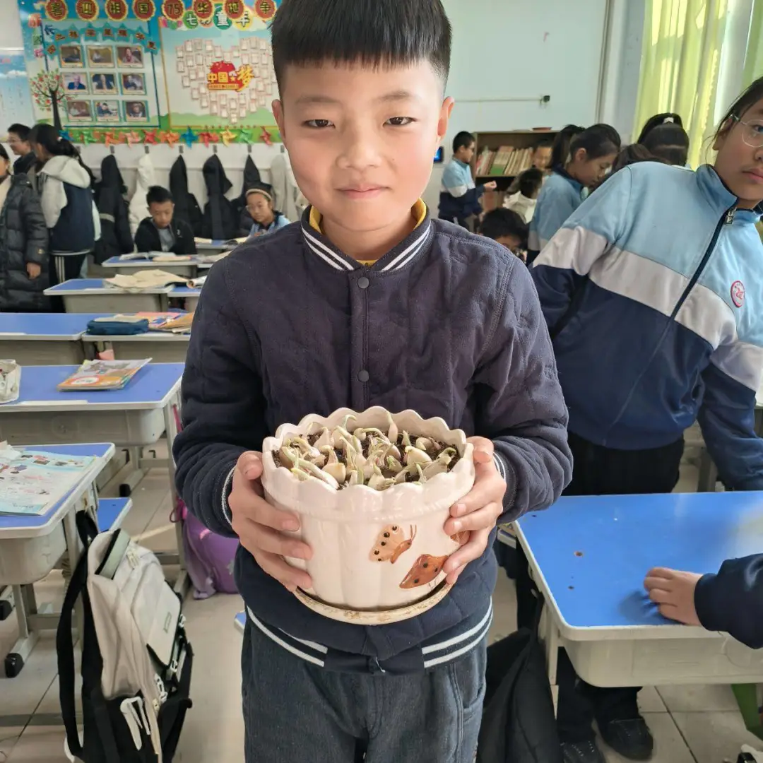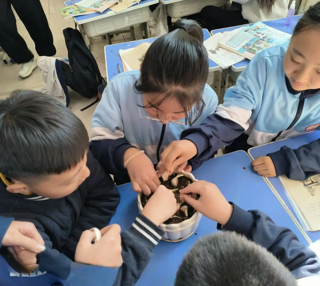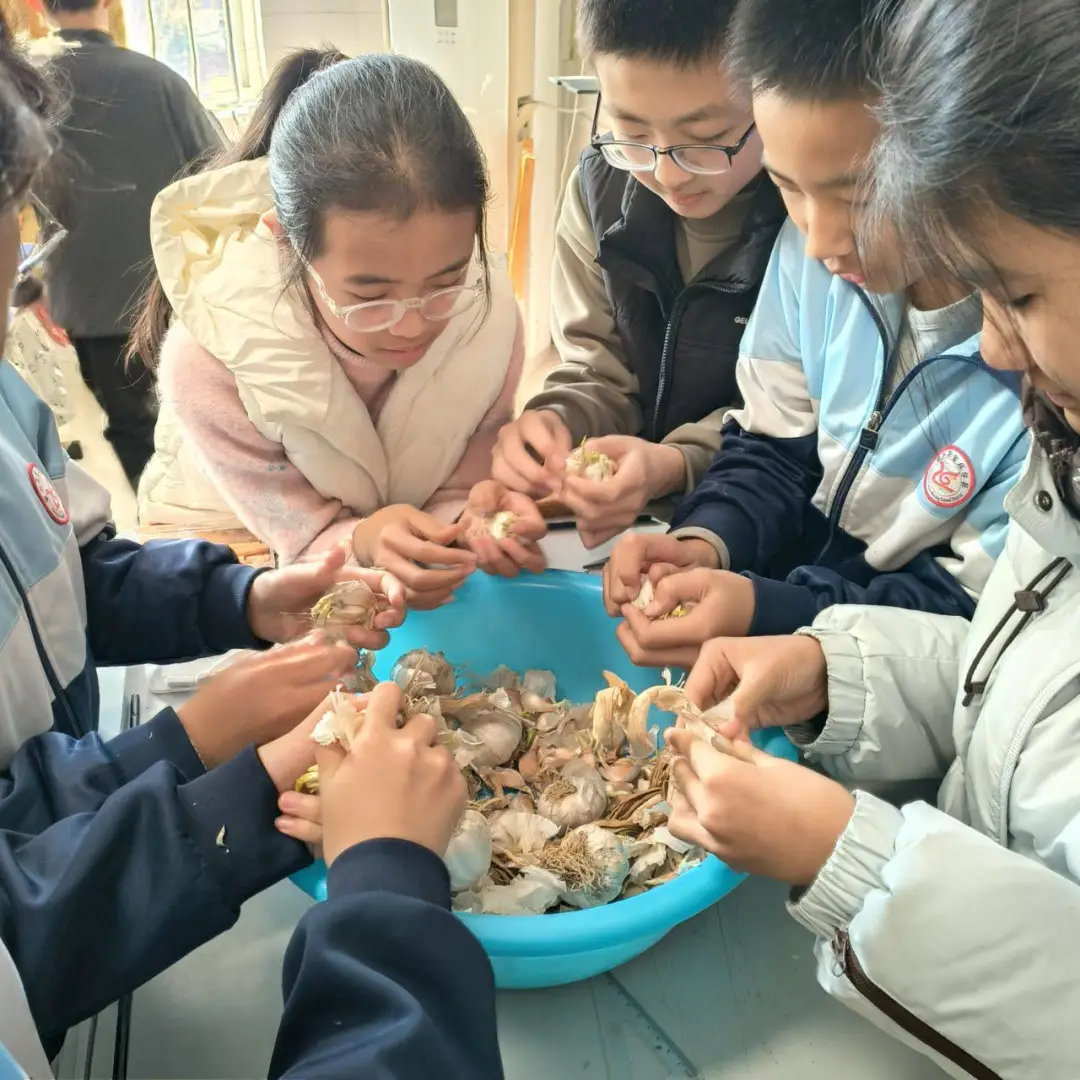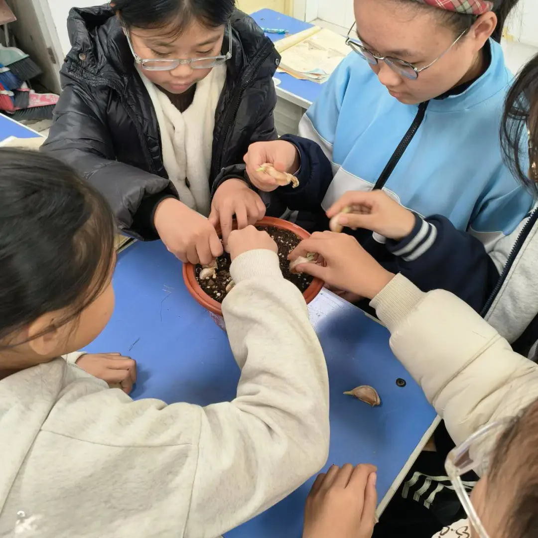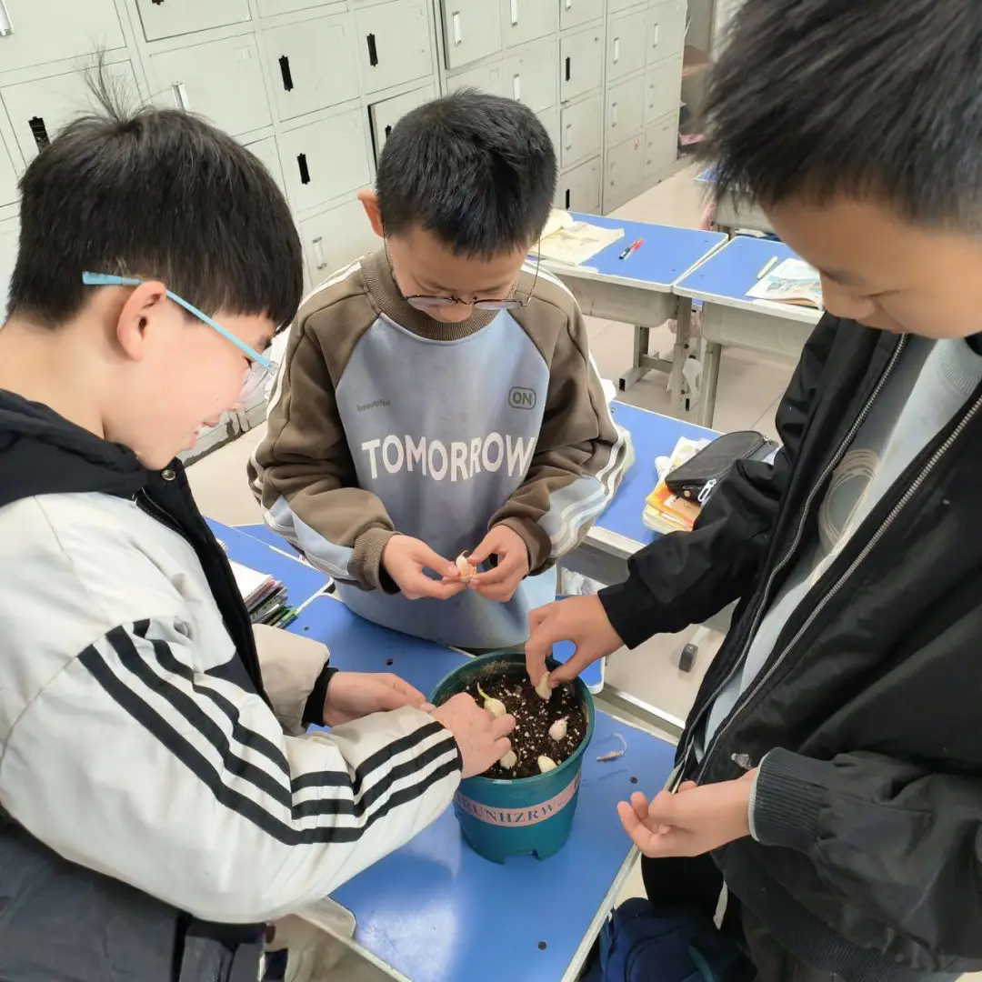 劳动课上,老师详细讲解了如何挑选饱满健康的蒜瓣作为种子,以及土培的具体步骤。同学们聚精会神地听着,眼中充满了好奇与期待。一拿到蒜种,大家便迫不及待地动手实践起来:小心翼翼地剥开蒜头,将一瓣瓣“种子”轻轻按入松软的泥土中。每个人都全神贯注,仿佛在完成一件神圣的作品,教室里洋溢着动手实践的兴奋与对绿色生命的无限期待。
