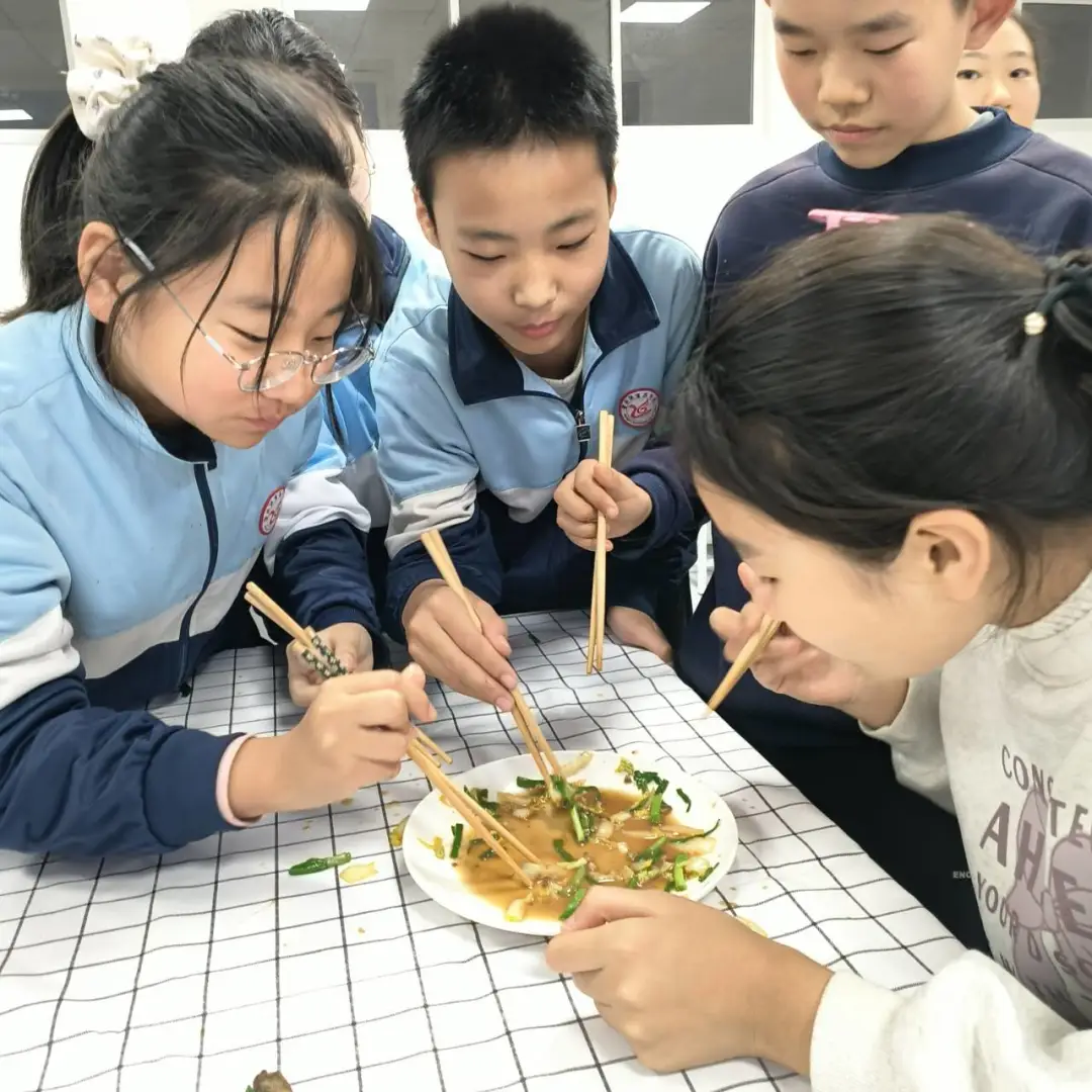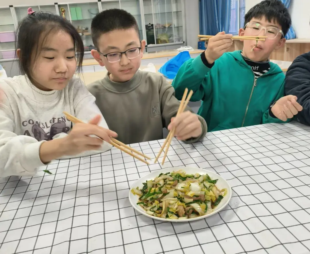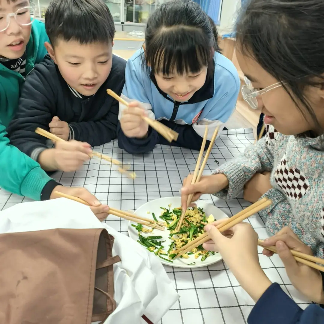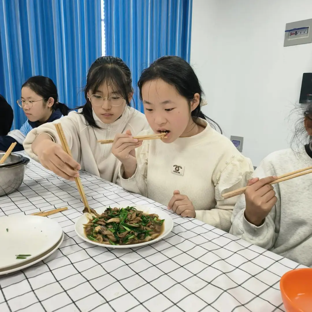 终于到了品尝的时刻!同学们围坐在一起,眼中闪烁着期待的光芒。轻轻夹一筷自己亲手炒制的蒜苗送入口中,那抹清甜与辛香在齿间绽放——是市场上买不到的鲜灵,是任何调料都无法复制的滋味。这一刻,他们真切地体会到:原来最顶级的调味料,名叫“汗水”;最动人的香味,源自“耕耘”。盘中普通的家常菜,因此成为了这个冬天最难忘的珍馐。