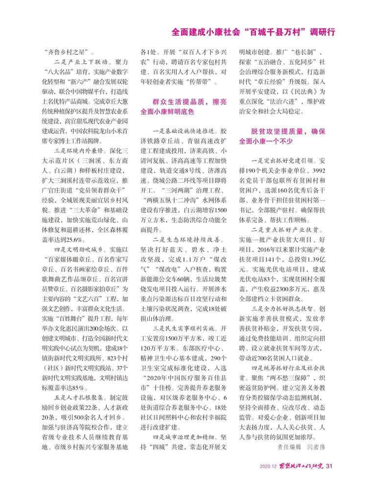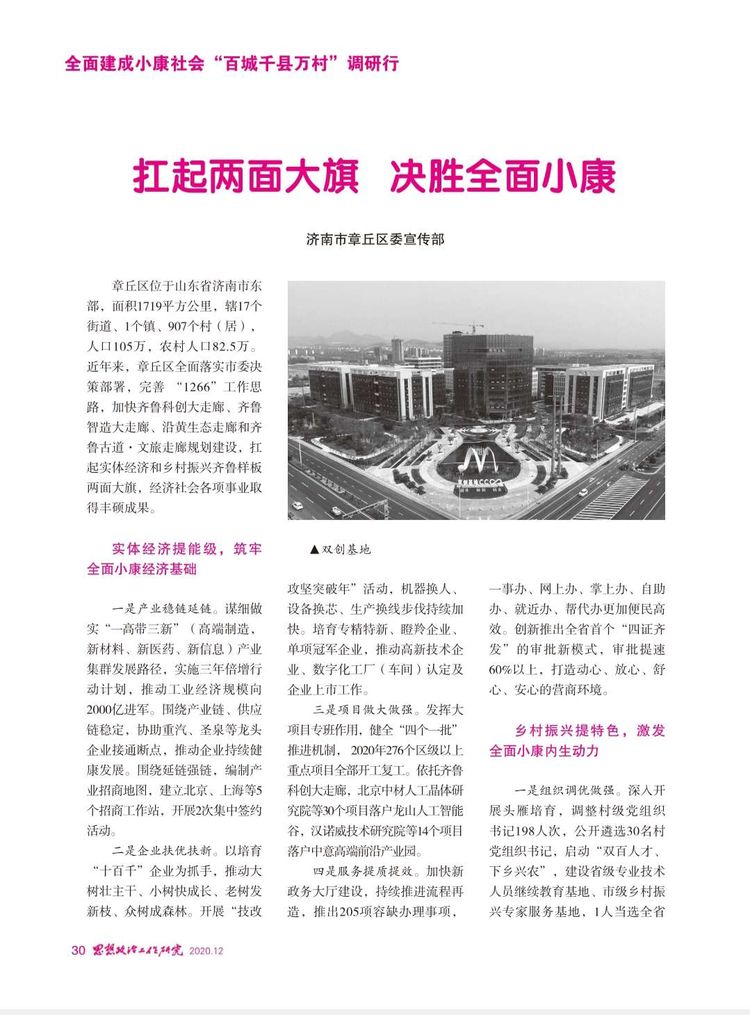 鲁网12月17日讯 近日,中宣部主管的月刊《思想政治工作研究》“全面建成小康社会‘百城千县万村’调研行””专栏中,以《扛起两面大旗决胜全面小康》为题,刊发章丘加快济东新区强势崛起、当好省会创新发展龙头的经验做法,再次把章丘工作推向了全国。