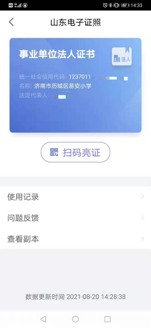 8月中旬,历城区委编办制发《历城区事业单位法人电子证照试点工作方案》和《工作指南》,明确具体工作措施及时间节点,将全部事业单位法人纳入试点工作范围。同时,选取历城区易安小学、历城区博物馆、历城区体育事业发展中心等3家事业单位法人,作为首批电子证照申领测试单位,经过注册登记、在线申领等流程,历城区易安小学率先完成领取工作,在“爱山东”APP实现手机端亮证,同步完成管理员、经办人注册。亮证过程中,工作人员也针对操作步骤进行了逐项记录和调试更正。