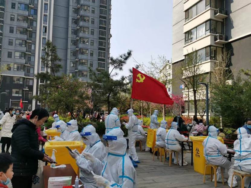 旗帜树立的地方就是阵地,就是责任。70余面鲜艳的党旗飘扬在各核酸检测点等重点区域,“党员先锋岗”是全区参加战疫的每一位党员干部的庄严承诺,一枚枚党徽是身份的展示,更是使命的担当。