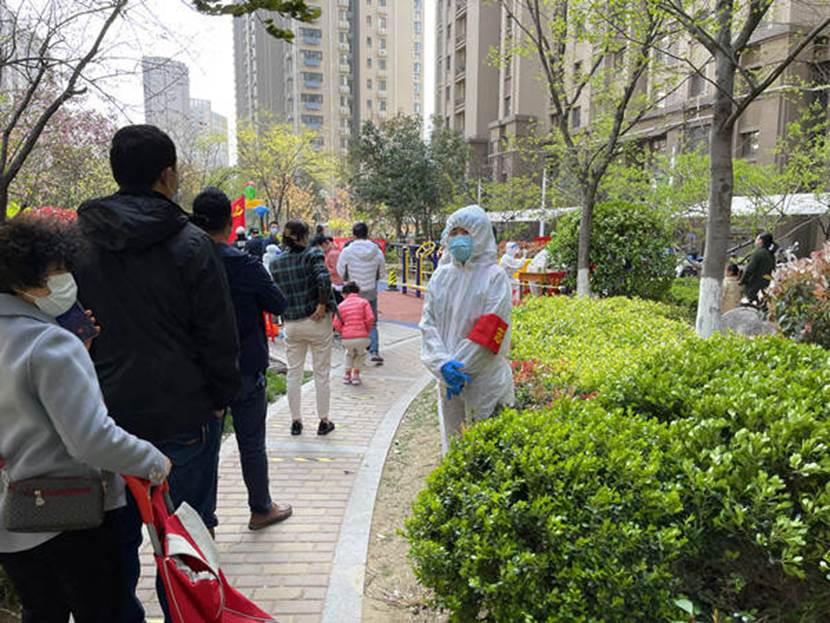 现场,与紧张、忙碌的工作人员相呼应的是安静、有序的社区群众们。无论是老叟还是孩童,都自觉的遵守一米线距离要求,默默的配合着。本是踏青出游的好时节,大家却自愿担负起一份使命,守护家国清明。