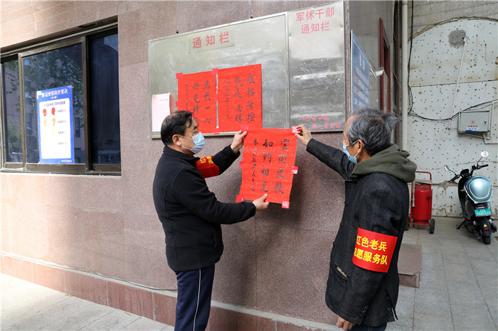 “看到街道发布的疫情防控志愿服务招募令,我跟老战友们都有一样的想法,这种时刻,必须得有我们啊!”说这话的,是文化东路街道“红色老兵”志愿队的发起人刘永海。这支队伍平均年龄63岁,由36名老将军和老战士组成。68岁的刘永海是这支队伍的“当家人”,他编写疫情防控志愿服务倡议书,号召辖区退役军人参与社区防疫工作,录制疫情防控温馨提示音频,提醒辖区居民遵守防疫要求;62岁的周晓光是队伍中的“大管家”,他跟随网格员一起逐户统计核实信息,宣传最新防疫政策和暖心提示,是居民口中的“敲门小红人”;69岁的吴秀远则是“书法担当”,他创作了多幅抗疫主题书法作品,为战“疫”一线的工作人员加油打气。