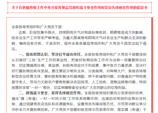 商河县始终把秋粮抢收工作作为当前一项重要政治任务,制发《关于在秋粮抢收工作中充分发挥基层党组织战斗堡垒和党员先锋模范作用的倡议书》,落实“县级领导干部联镇指导、镇街干部联村协调、村干部联户帮扶”分级响应措施,以农村管理区为单位组建79支党员志愿服务队,组织1270余名镇街党员干部、第一书记等包挂516个行政村,1316名村干部、村民小组长重点帮包1369户困难户,针对种粮大户、家庭农场、小农户及困难群众等不同帮扶主体分类施策,及时协调解决机械调配、农田排涝、湿粮运转等问题。