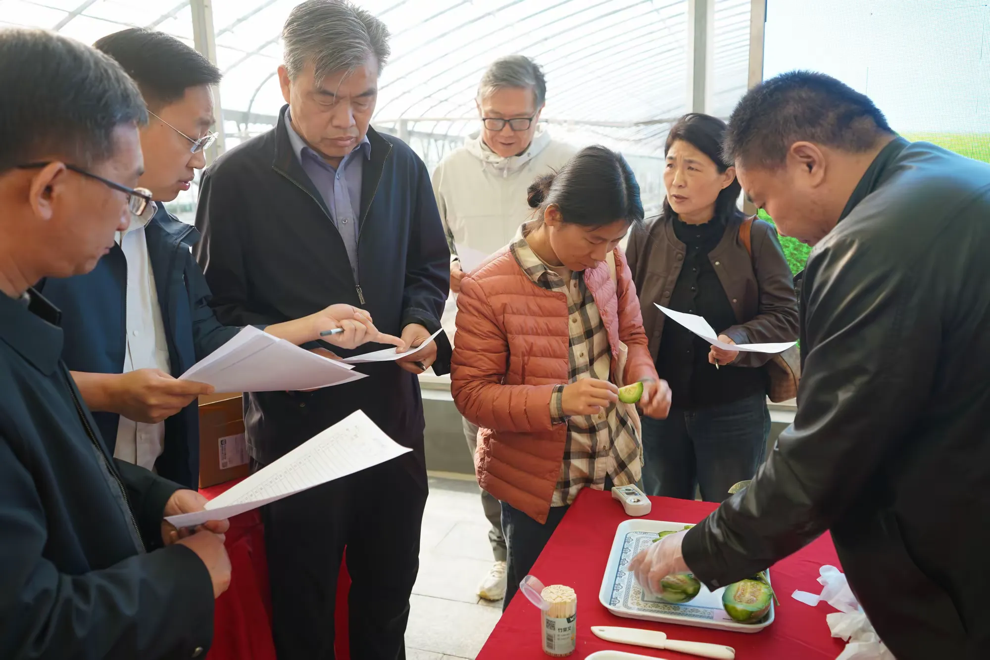 本次评选邀请农业专家、品鉴达人组成权威评审团,从甜度、口感、外观、重量、农残检测等多个维度进行严格打分。评选现场,来自全街道43家合作社的30余名种植户代表带着自家种出的“得意之作”同台竞技。一张长桌摆开,一个个甜瓜整齐排列,圆润饱满、色泽鲜亮,光是摆在那儿就让人移不开眼。