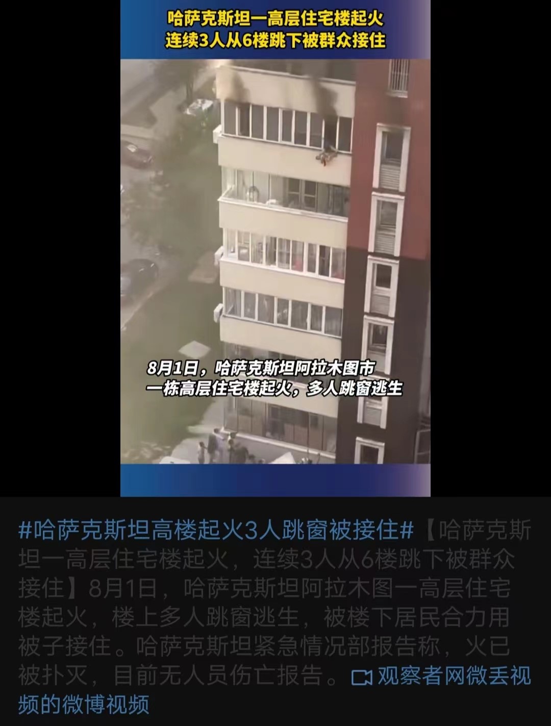 6月5日,有网民在短视频平台发消息称“山东省济南跳楼事件”,视频显示一高层住宅楼起火,连续3人从6楼跳下。