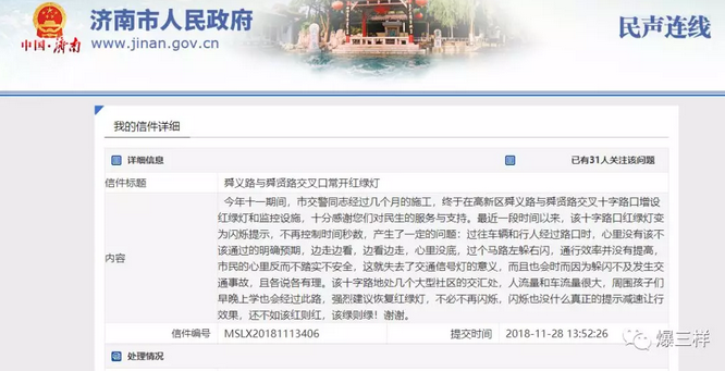 大众网·海报新闻记者注意到,在济南政府网民声连线栏目,5个月前,有市民对涉事路口红路灯设置提出了质疑。