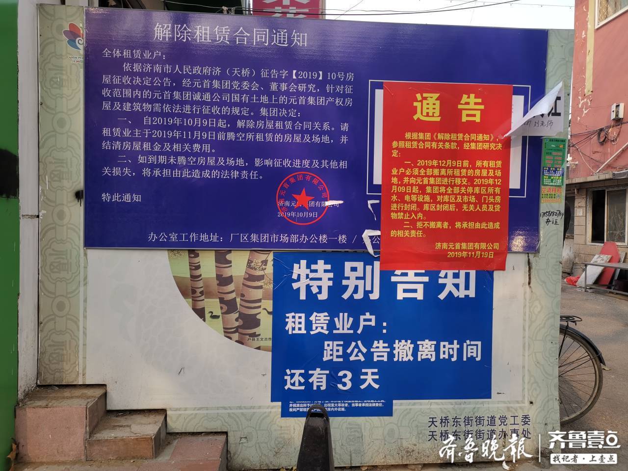 12月8日是眼镜市场最后一天正常营业。下午2点,记者来到位于天桥区义和街5号的济南眼镜市场。市场门口张贴有两则通知。其中一份为济南元首集团发布的《解除租赁合同通知》,上面称自10月9日起解除房屋租赁合同,让租赁业主在11月9日前腾空房屋和场地。另一份通告则限所有租赁业户在12月9日前必须全部搬离,12月9日起将关停库区所有水、电等设施,并对市场、门头房进行封闭。