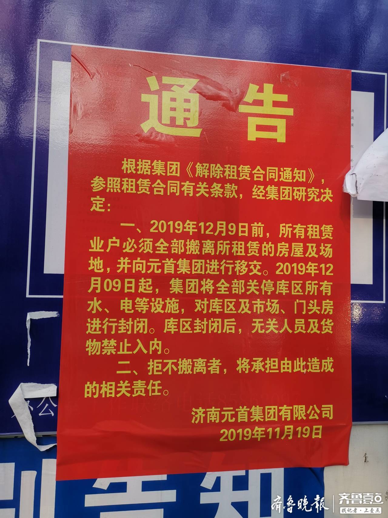 据市场办公室的一名工作人员介绍,搬迁通知是10月9日贴出来的,限期一个月让业户搬离,他们领导觉得时间太仓促了,只有一个月不够业户另找新的店址,所以元首集团后来又把时间宽限到12月9日,即限租赁业主在两个月时间内腾空房屋和场地。12月9日后,市场就断水断电不再经营了。