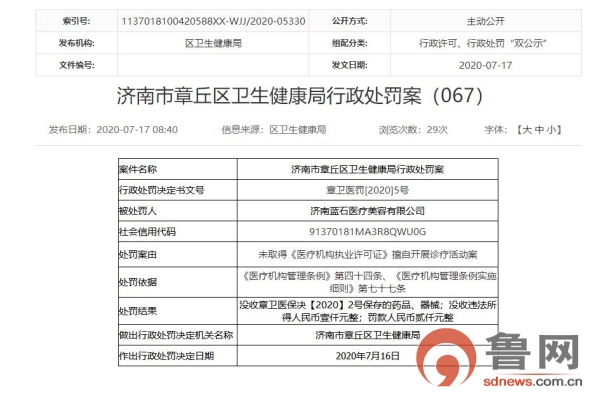 济南市章丘区卫生健康局官网发布行政处罚决定书(章卫医罚【2020】5号)显示,因未取得《医疗机构执业许可证》而擅自开展诊疗活动,对济南蓝石医疗美容有限公司予以没收证据先行登记保存决定书保存的药品、器械,并没收违法所得人民币1000元,罚款人民币2000元。