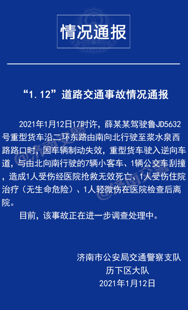 2021年1月12日17时许,薛某某驾驶鲁JD5632号重型货车沿二环东路由南向北行驶至浆水泉西路路口时,因车辆制动失效,重型货车驶入逆向车道,与由北向南行驶的7辆小客车、1辆公交车刮撞,造成1人受伤经医院抢救无效死亡、1人受伤住院治疗(无生命危险)、1人轻微伤在医院检查后离院。目前,该事故正在进一步调查处理中。