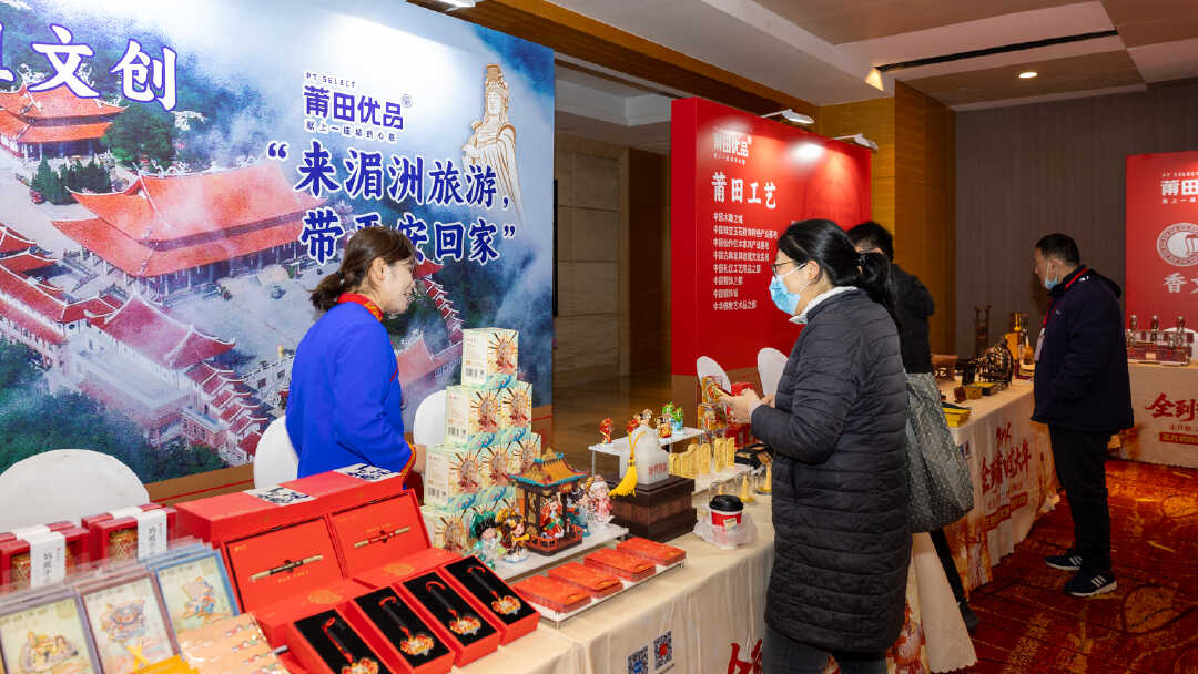 推介会设置了丰富的互动环节,湄洲女迎宾、暖场文旅宣传片展播营造出浓厚氛围。在莆田优品展示区与体验区,莆田鞋、木雕摆件、香道文化产品、特色文创等展品吸引众多嘉宾驻足参观、互动洽谈,进一步深化了两地产业交流。