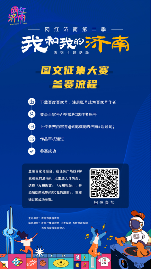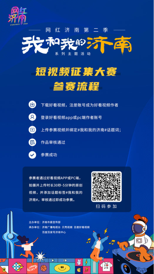今年第二季“网红济南”开启了全新的主题——“我和我的济南”系列主题活动,活动与百度好看视频平台共建话题,旨在鼓励网友用镜头发现泉城之美,用最流行的方式讲述济南故事,通过形形色色的人物展现济南这座城市的温度。大赛征集分为“我和我的济南短视频征集大赛”和“我和我的济南图文征集大赛”两部分。