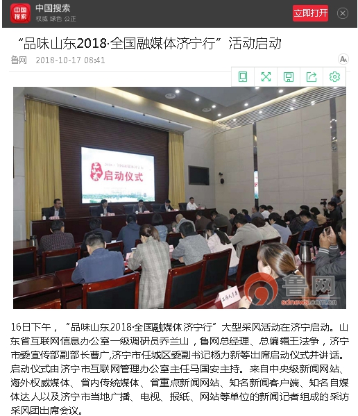 截至目前,新华网、中国搜索等20余家中央、省市重点新闻网站、商业网站、移动新媒体共发布活动稿件300余篇;百度搜索“品味山东”关键词,得到的搜索结果累积达274万条,直接搜索“品味山东2018·全国融媒体济宁行”,得到的搜索结果为37100条,且已经形成了热词关联效应。