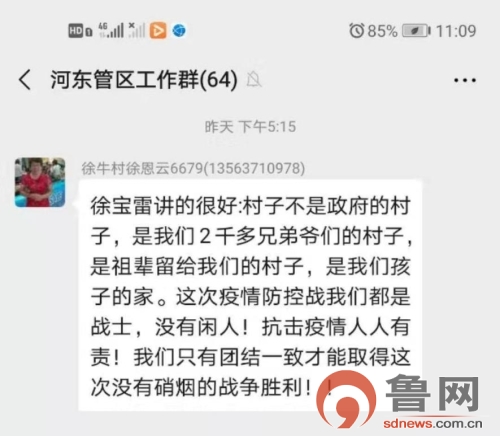 鲁网2月5日讯(记者孙诗梦 通讯员孙晨)“村子不只是政府的村子,是我们2000多兄弟爷们的村子,是祖辈留给我们的村子,是我们孩子的家!这次疫情防控战我们都是战士,没有闲人!抗击疫情人人有责!我们只有团结一致才能取得这次没有硝烟战争的胜利!”刘楼镇徐牛村村民徐宝雷热泪盈眶的说道。