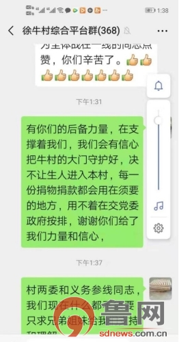 “有大家在不断的给我们力量,我们有信心把徐牛村的大门守护好,决不让任何生人进入本村,每一份捐物捐款都会用在最需要的地方,用不着的交给党委政府安排,谢谢你们给了我们力量和信心!”村两委干部徐恩前在徐牛村的微信群内说道。