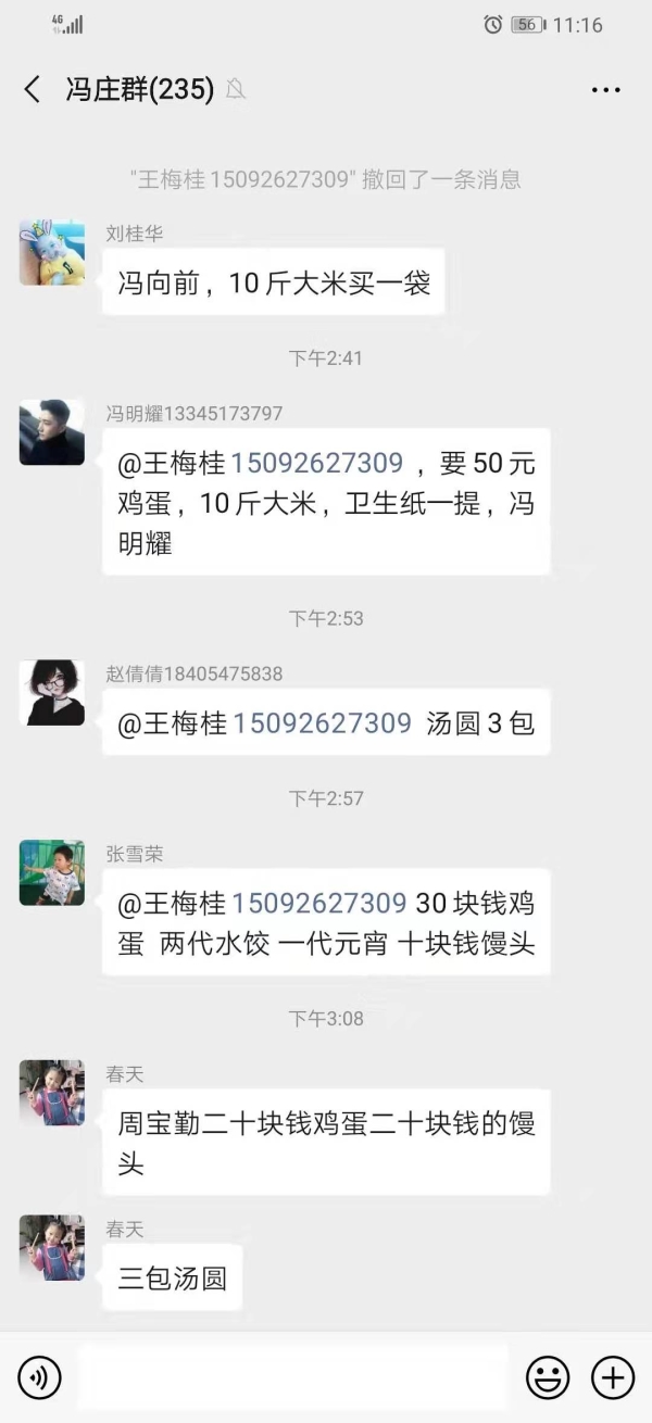 2月7日晚上,所有村民以户为单位,在冯庄村采购微信群发送了所需生活物资的名称及数量,经王梅桂汇总后,将于8号中午向超市统一下单,超市接单后将每户货物单独打包,预计于9号上午运送至村头疫情防控检查点,再由王梅桂从这个“临时中转站”取得货物,送达至每户门前,离开后在微信上通知户主出门领取,确保采购员与超市、村民双双互不相见,所有资金一律通过微信转账,从而实现户户隔离、避免交叉传染。